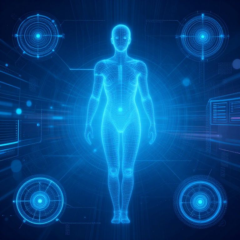 Blue holographic digital representation of a human figure with futuristic technical interface elements surrounding it. The image features glowing grid lines and circular data displays, representing artificial intelligence and advanced technology in a sci-fi style.