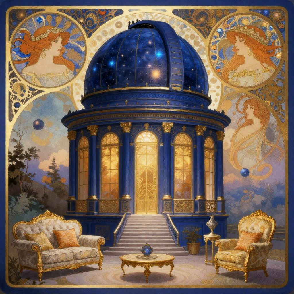 A collage illustrating a celestial observatory adorned with luminescent indigo with warm gold accents. The artwork should embody an ethereal quality with rich textures, intricate linework, and luxurious furnishings, set against a dreamy, soft-focus background, influenced by art nouveau flourishes inspired by Alphonse Mucha.