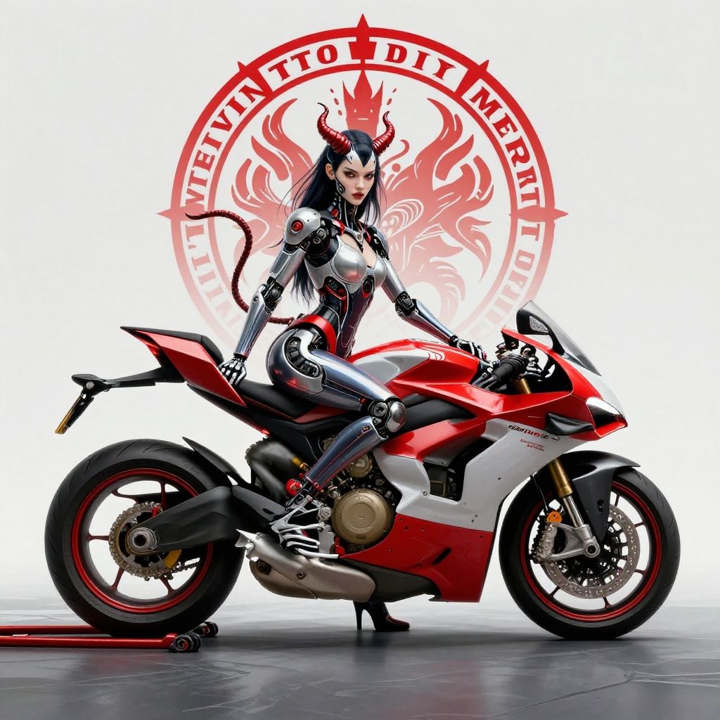 Dystopian terror, poster_\(medium\), Full length, distance, full body, perfect photograph, vivid detail, (( futuristic cybernetic devilgirl on a futuristic battle Ducati in a terrifying dystopia))emblem, (simple_background:1.3), symmetry, (no_humans:1.3), (masterpiece:1.3), (best_quality:1.3), (ultra_detailed:1.3), 8k, extremely_clear, realism, (ultrarealistic:1.3), insane details, perfect anatomy, intricate details, hyperdetailed, ultra detailed, extreme detailed, highest detailed, high_detail, colorful, beautiful, hdr, photorealistic, highres, ultra_high_res, photography, aesthetic, extremely_delicate