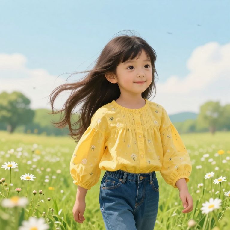 A young girl with long, flowing dark hair that cascades down her back, soft brown eyes filled with warmth and curiosity, and a gentle, joyful expression, wearing a bright yellow cotton shirt with a small floral pattern and comfortable dark blue jeans with a subtle belt, standing in a sunny meadow filled with blooming wildflowers and delicate daisies. A soft breeze gently lifts her hair and clothes, creating a natural, organic movement. The background features a gentle gradient from soft pastel blue sky to lush, vibrant green fields, with scattered sunlit trees and a few birds in the distance, capturing a peaceful, serene, and joyful atmosphere that radiates happiness and innocence.
