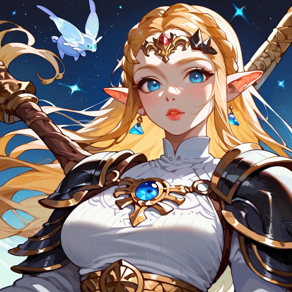 Score_9, score_8_up, score_8, medium breasts, (Necron:1.4), black armor, weapon, armor, princess zelda, long hair, crown braid, pointy ears, black pants, tight pants, green eyes, solo, looking at viewer, upper body, starry sky, space, zPDXL