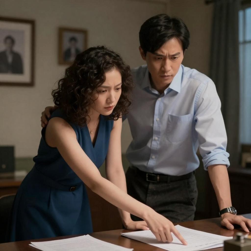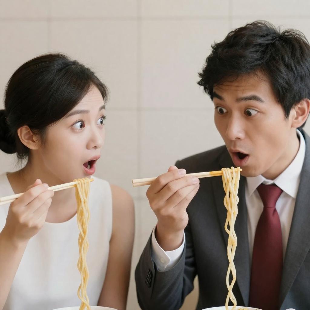 Asian man and woman eating noodles with chopsticks in a kitchen. Man in suit, white shirt, red tie; woman in white shirt. Both with intense focused expressions. Beige tiled background, kitchen utensils. Woman on left, man on right.