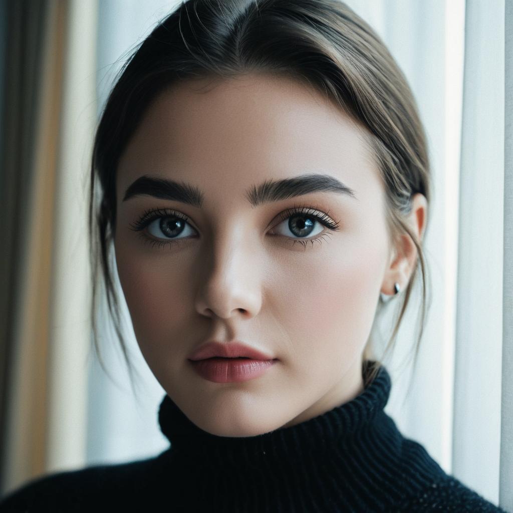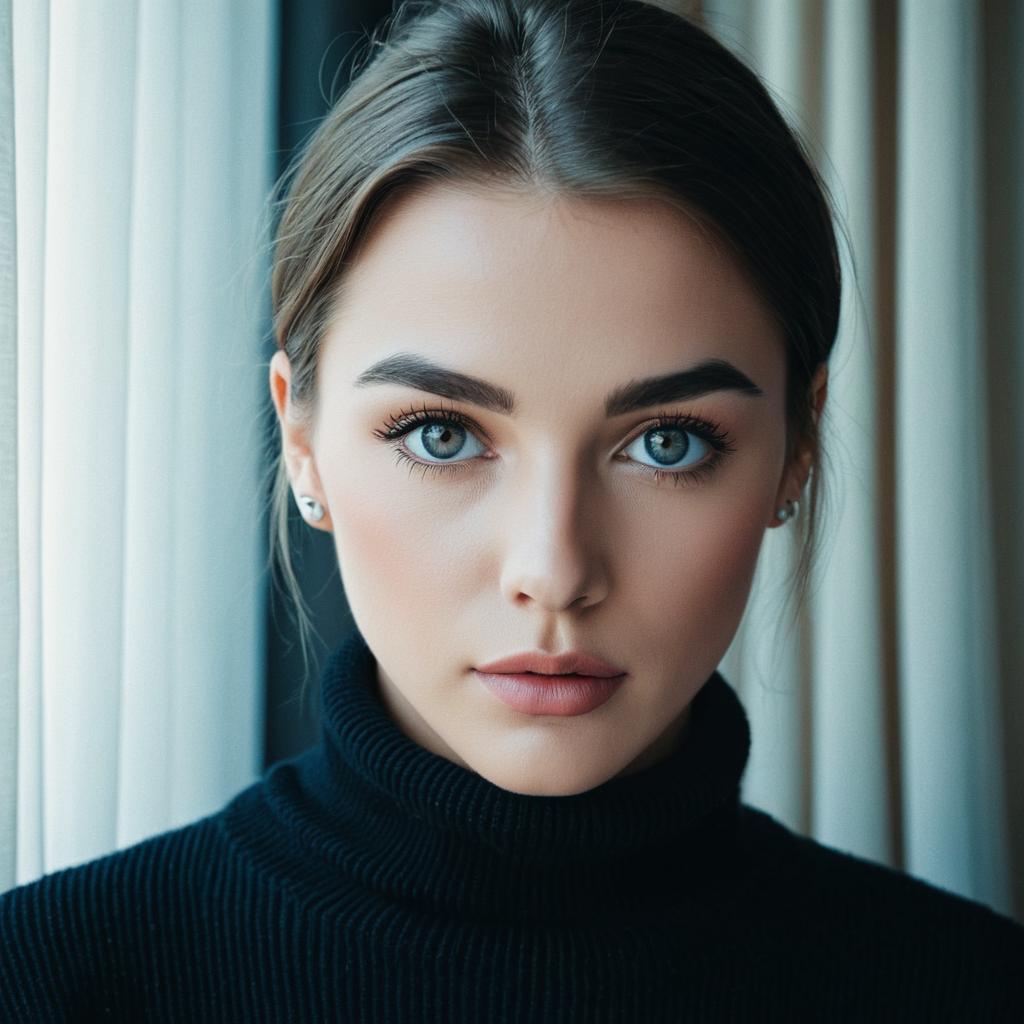 A close-up portrait of a young woman with piercing blue eyes and thick eyebrows, wearing a black high-neck sweater, soft natural light illuminating her face, soft focus background with light curtains, cool tone, subtle contrast, soft blue color