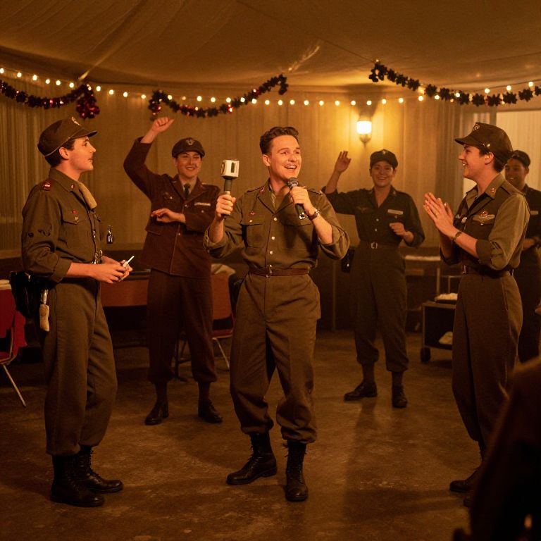 USO themed scene depicting a lively 1940s USO camp with soldiers and entertainers in vintage uniforms, warm lighting, festive decorations, and an atmosphere of camaraderie and hope during wartime.