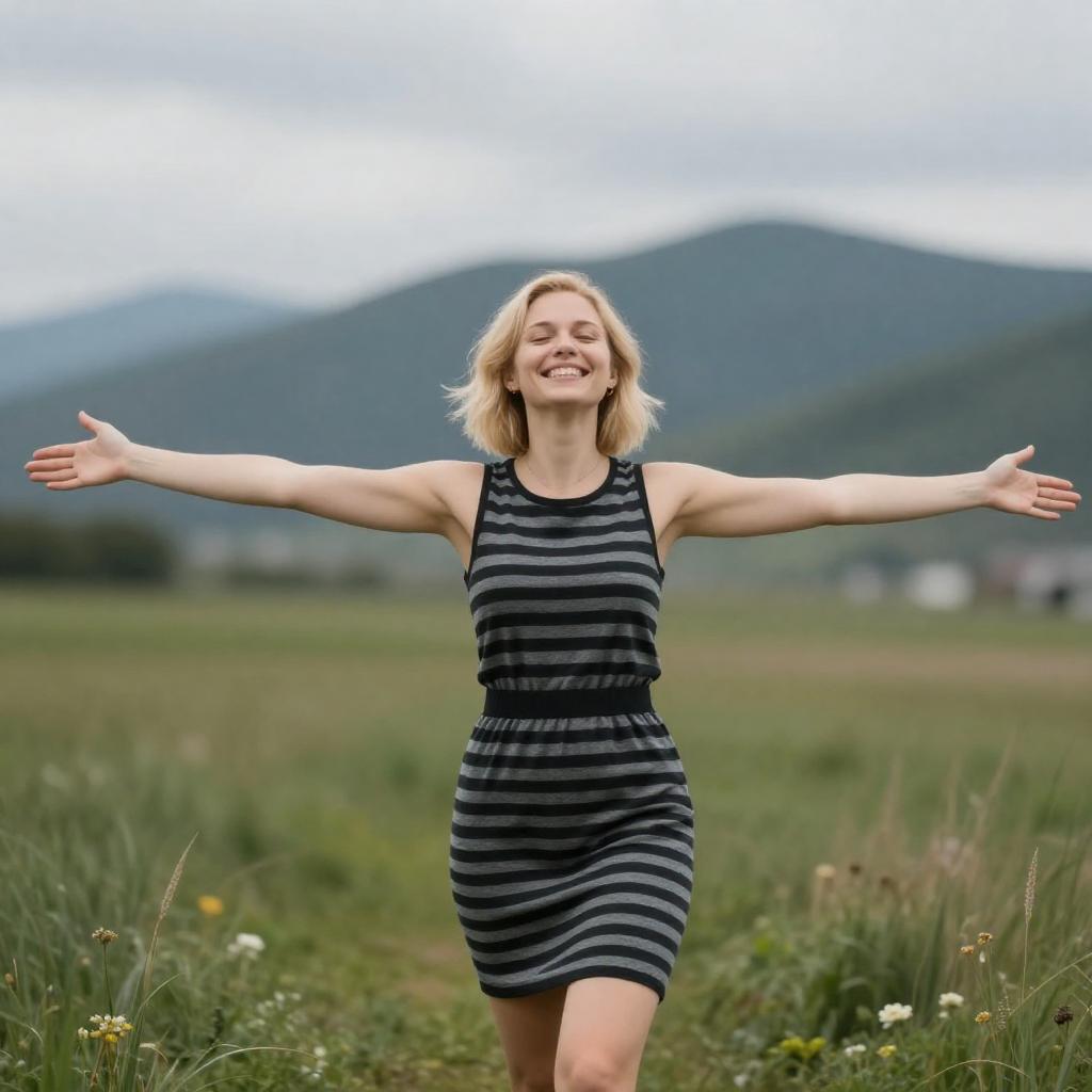 Blonde woman in black blouse and gray pinafore dress, arms outstretched, smiling, standing in green field with yellow flowers. Snow-capped mountains in background. Daytime, clear sky. Woman centered, mountains behind, field in foreground.
