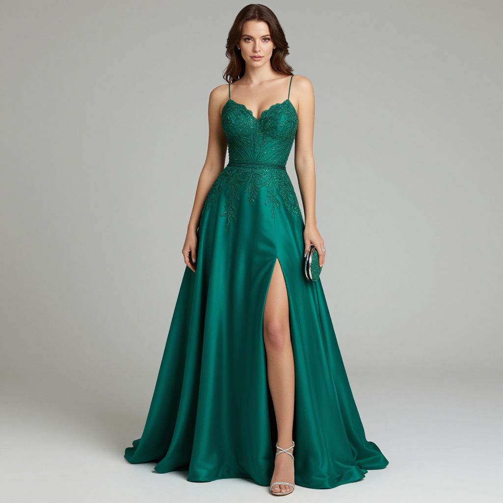 "Elegant plunging neckline gown, satin fabric, deep emerald green, fitted bodice, flowing A-line skirt, intricate lace appliqués, subtle shimmer, thigh-high slit, delicate spaghetti straps, matching emerald green clutch, strappy silver heels.. Sexy. Pretty face and beаutiful eyes. Big breasts."