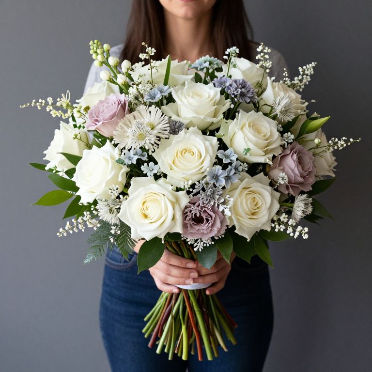 Photograph of a woman from the shoulders down, holding a large bouquet of mixed flowers. The bouquet includes white and pale pink roses, white and purple ranunculus, small white filler flowers, and greenery. The woman's hands, with light skin, grip the stems tightly at the bottom. She wears a white shirt and dark blue jeans, set against a plain gray background. The flowers are arranged in a rounded, lush composition, with varying textures and colors creating a vibrant yet elegant display. The woman's face is not visible.