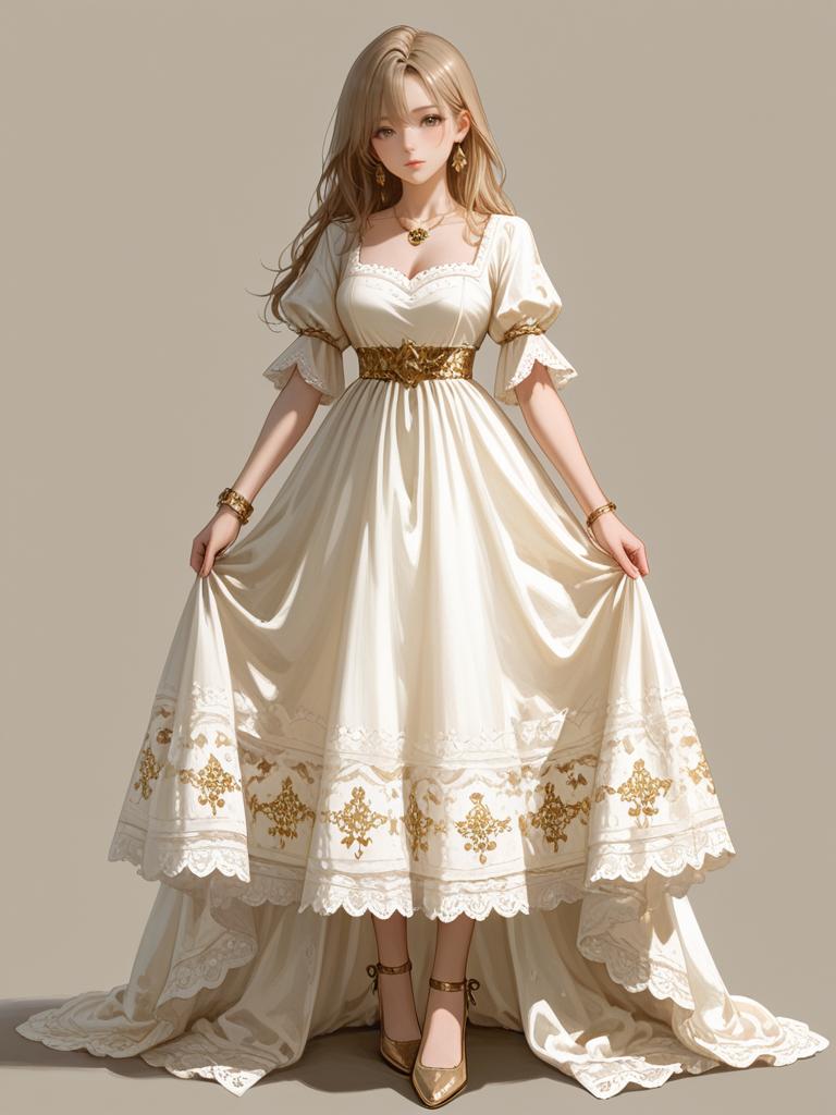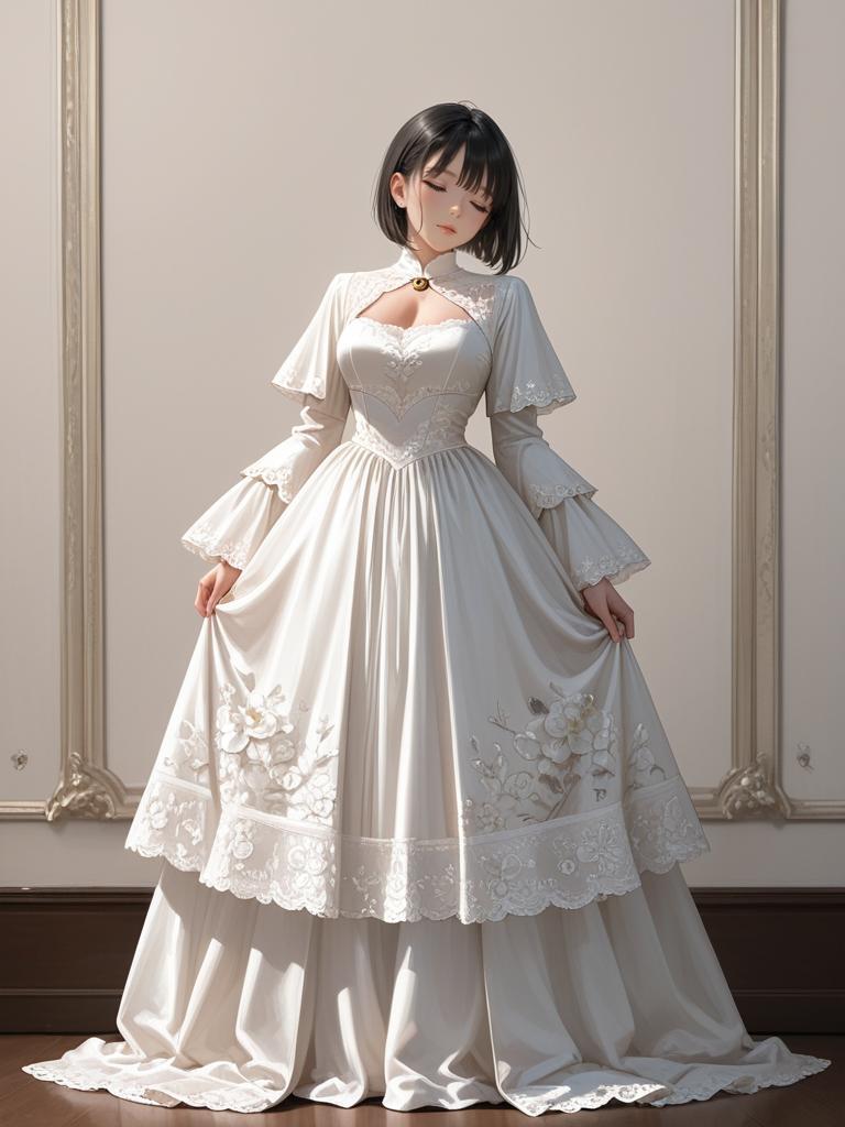 1girl, realistic face, full body shot, Woman, romantic, white lace dress, long bell sleeves with floral appliqué, round neckline, fitted silhouette, mini-length with scalloped hem featuring cut-out floral details, minimal accessories
