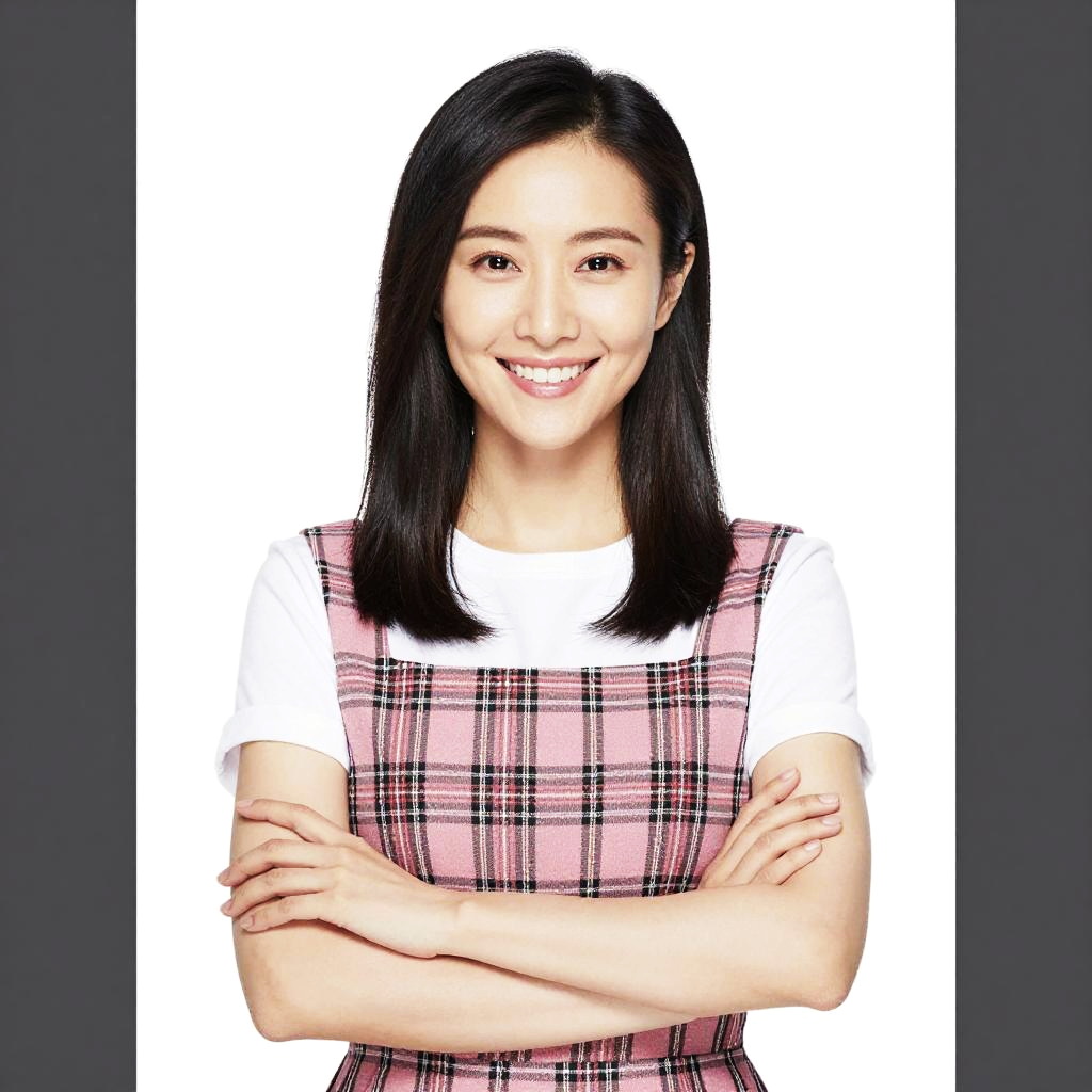 This is a photograph of an Asian woman with straight black hair, smiling warmly at the camera. She has a light skin tone and is dressed in a white short-sleeved shirt under a pink plaid sleeveless dress. She stands with her arms crossed, showcasing a confident and friendly demeanor. The background is completely white, making her the focal point of the image. The photograph has a clean, professional look with sharp details and even lighting. The plaid pattern on her dress features black and pink lines, adding a touch of contrast to her outfit.