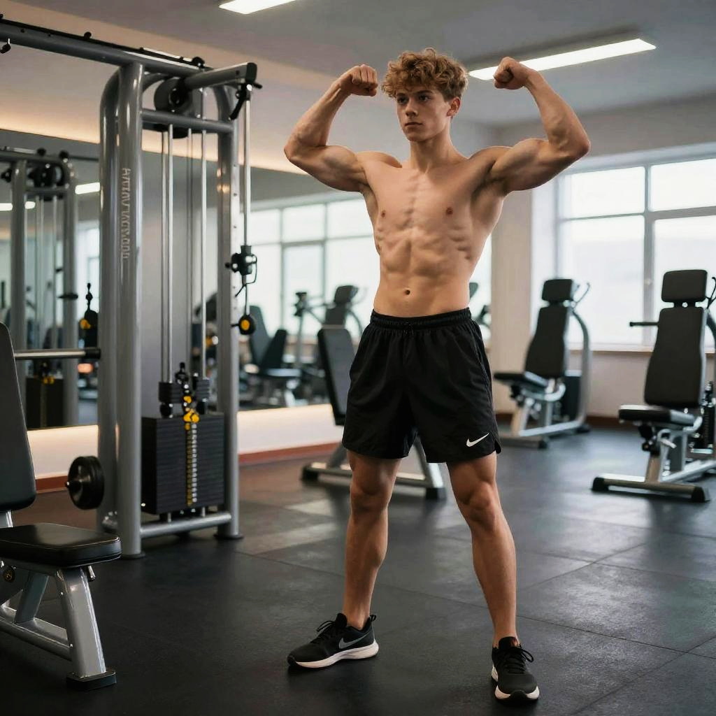 Bodybuilder teen stretching before workout in a high-tech fitness studio, reflective floors, advanced equipment, soft natural lighting, detailed muscle texture, realism