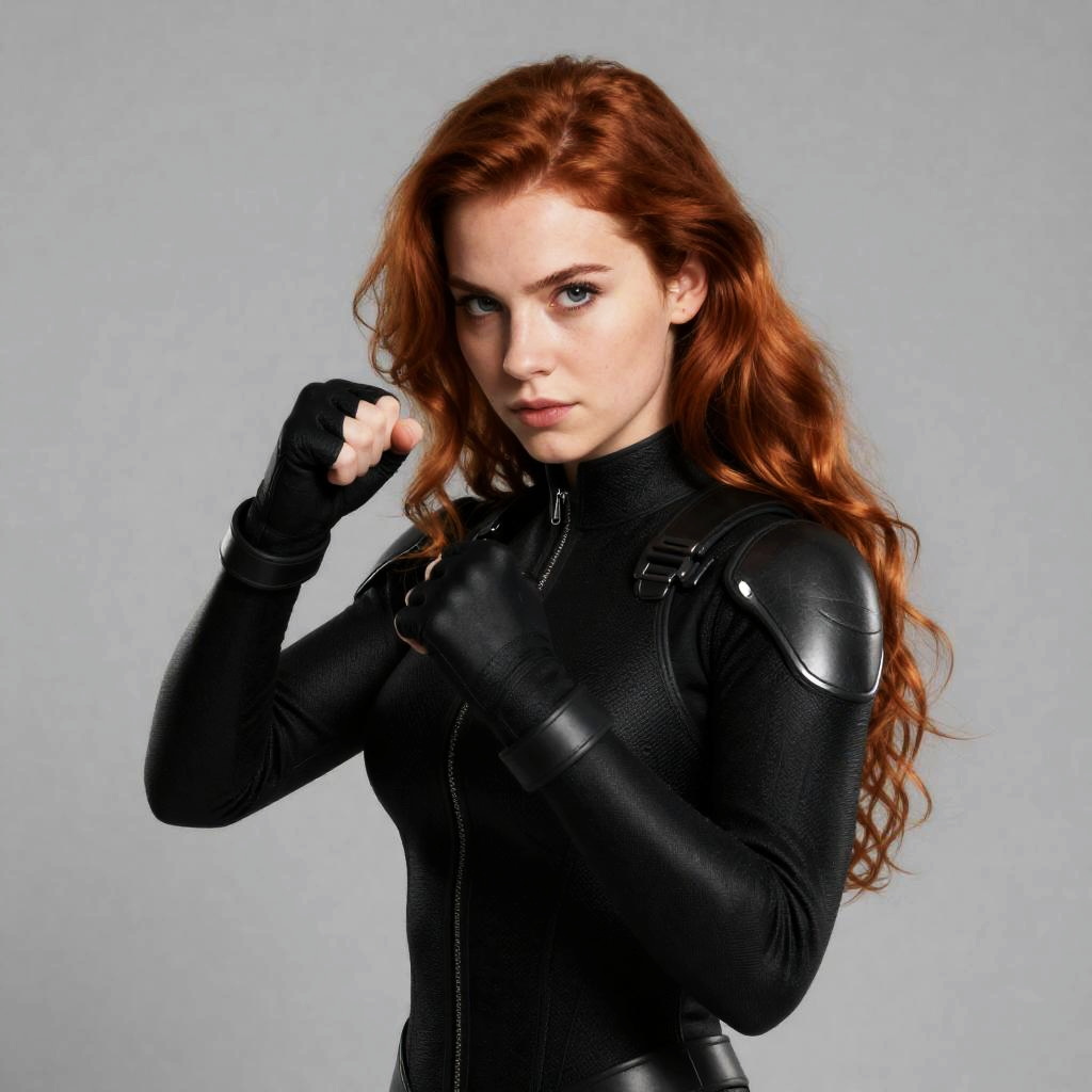 Denmark 1girl, beautiful face, ginger hair, wavy hair, long hair, black battlesuit, fighting pose, realistic
