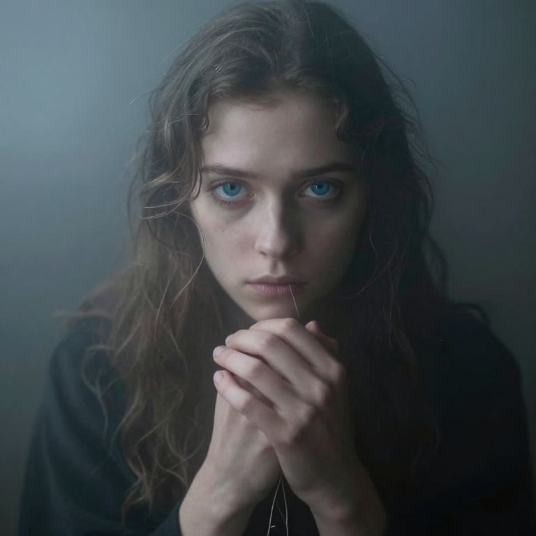 Imagine an alluring portrait with lighting reminiscent of Rembrandt's signature style, depicting a lone figure with striking blue eyes enveloped in dense mist. From an overhead perspective, observe the meticulous details of their bony hands clasped together, as they seem to cling to the last threads of hope amidst a world cloaked in uncertainty. The gentle light from afar barely pierces through the fog, highlighting only the subject and creating a sacred ambiance around them, invoking both melancholy and compassion within the observer.