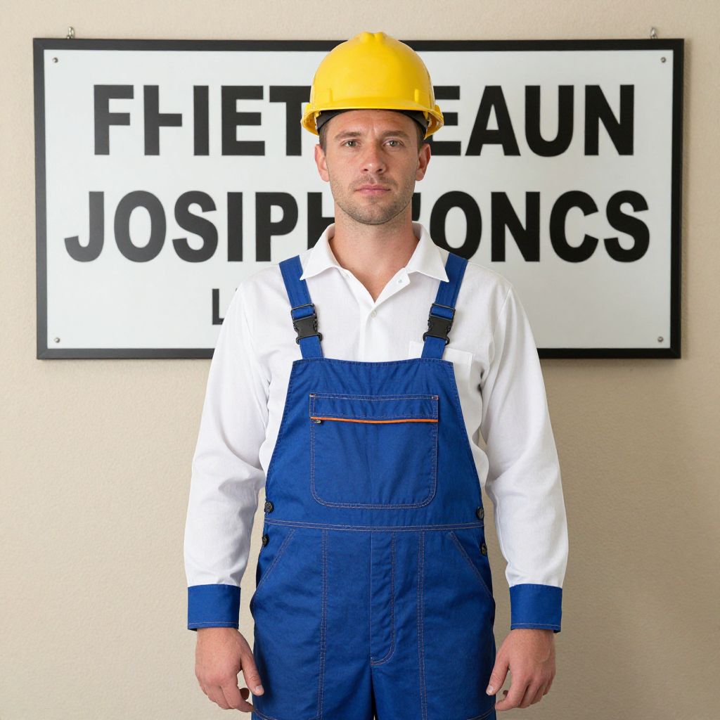 Photograph of a Caucasian man with light skin and short brown hair, wearing a yellow hard hat, white long-sleeve shirt, and blue overalls. He stands against a beige wall with a large white sign featuring black bold letters reading "FHEAUN JOBSITE" in the background. His expression is neutral, and he has a slight stubble on his face. The overalls have a pocket on the front and black straps. The image is brightly lit with a sharp focus on the subject.