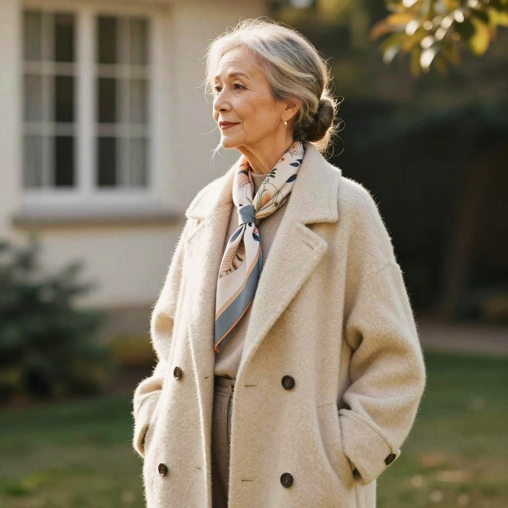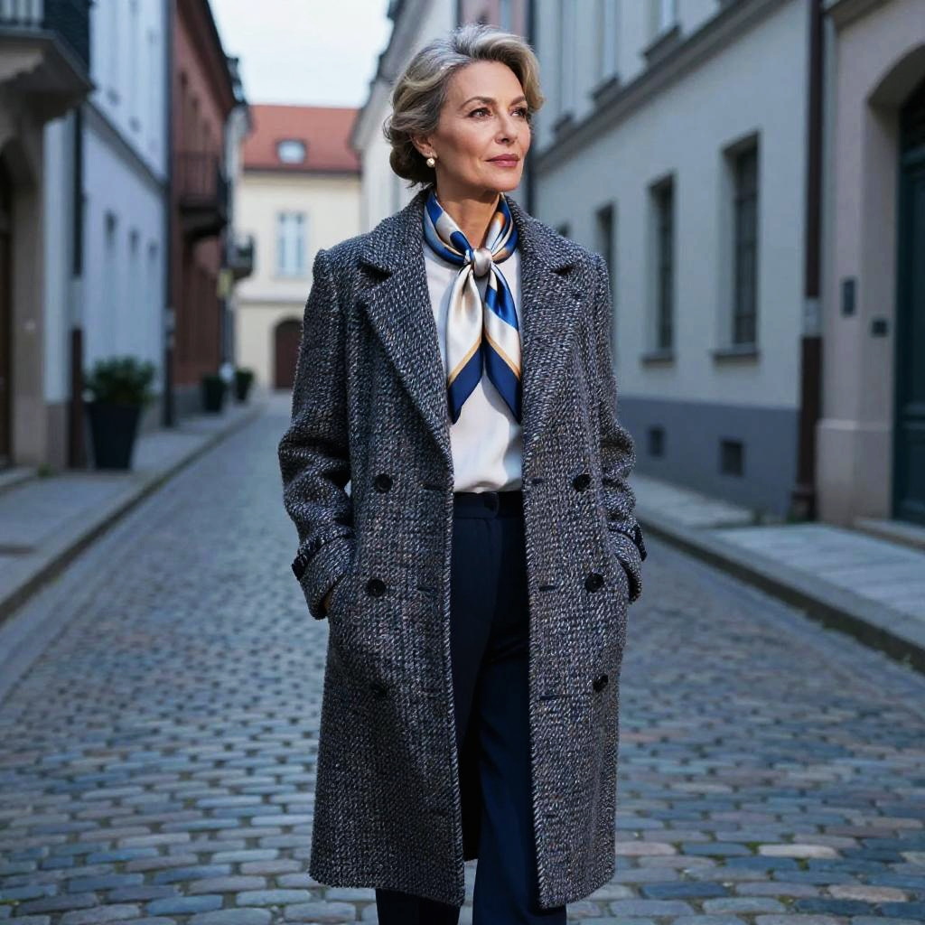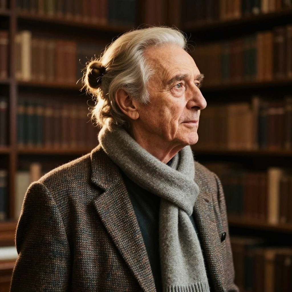 Loose Bun hairstyle on mature male model, wearing tweed waistcoat with wool overcoat and silk scarf, in historic library atrium, captured in fashion editorial style with warm tungsten accents with soft window light.