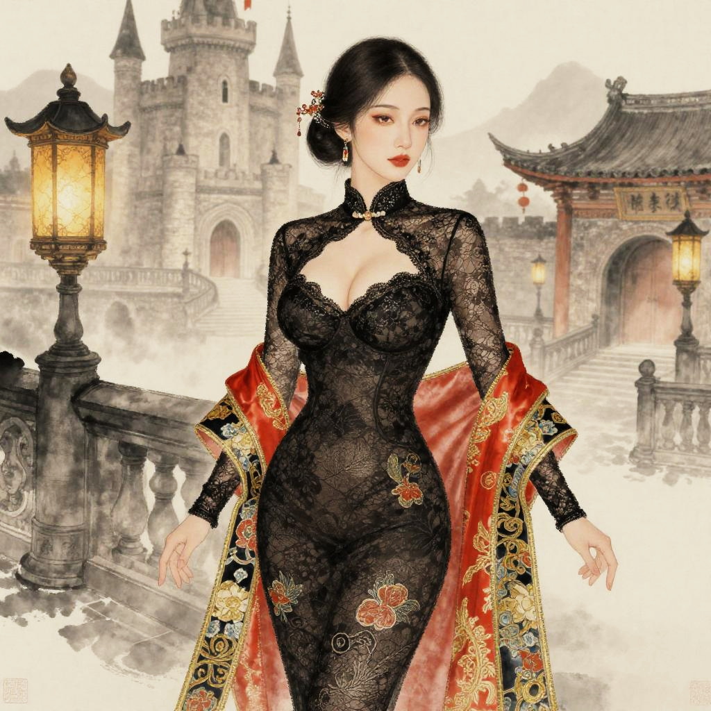 A woman in a black lace bodycon dress with floral patterns, high neckline, and long sleeves, standing in a castle courtyard with lanterns, in the visual style of Richard Estes. Sexy. Pretty face and beаutiful eyes. Big breasts BREAK chinese, asian, traditional Chinese aesthetics, delicate brushwork, ink wash painting textures, vibrant red and gold accents, elegant Asian female, silk fabrics, ornate patterns, soft lighting, ethereal atmosphere