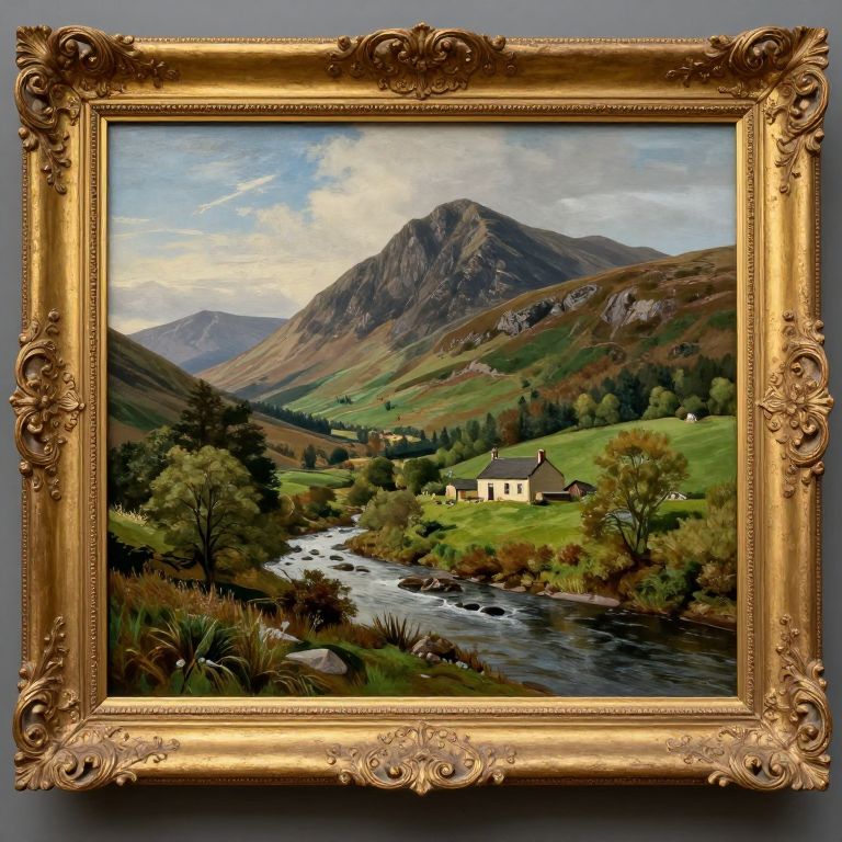 A 19th-century Scottish mountain landscape painting, framed in ornate gold, captures a serene rural scene with rolling hills, a tranquil river, and a quaint cottage nestled among lush greenery, showcasing the detailed realism and naturalistic style characteristic of the period.