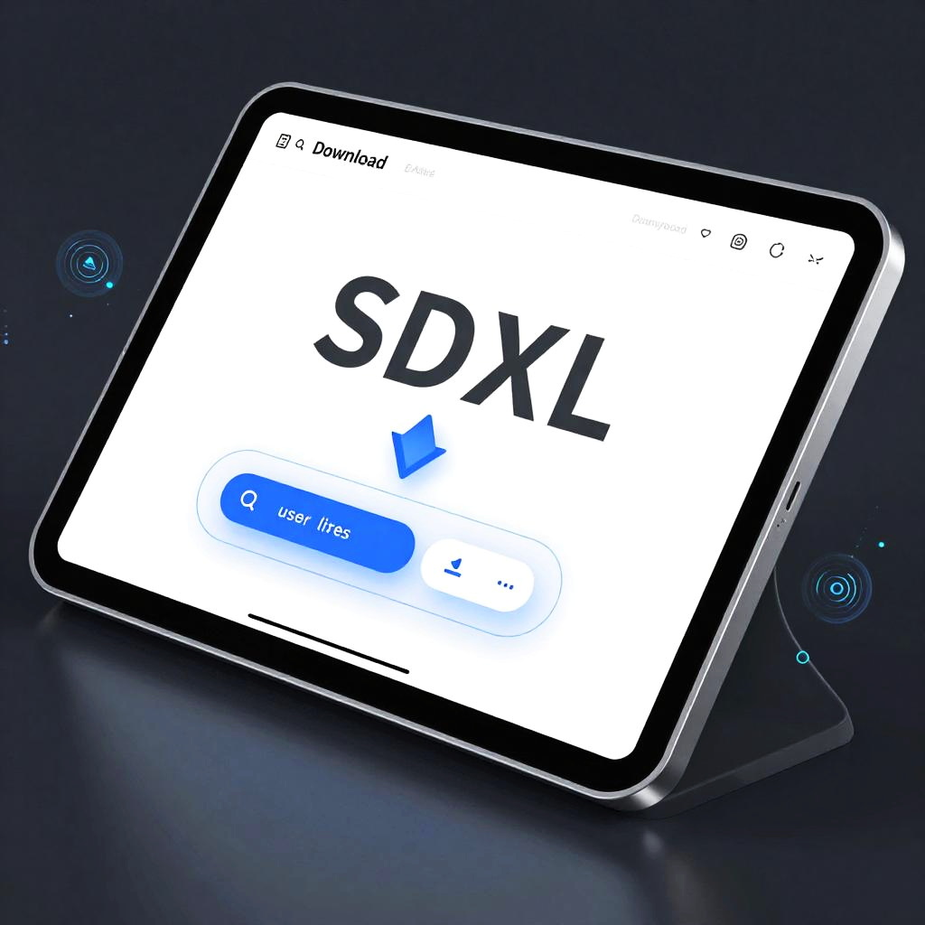 Download sdxl user interface design, futuristic tablet screen with interactive download progress, holographic buttons and sleek metallic frames, surrounded by glowing digital particles and tech symbols, modern cyber technology style, sharp and clean details