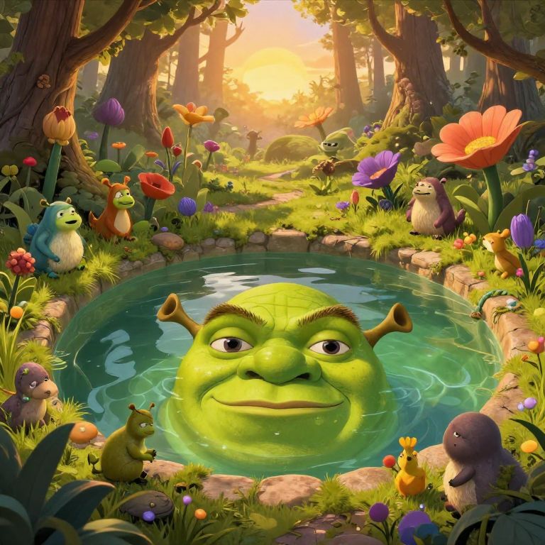 Shrek pool in a fairy tale forest, tranquil green water pool shaped like Shrek’s face, surrounded by whimsical swamp creatures and oversized flowers, warm sunset lighting, storybook illustration style