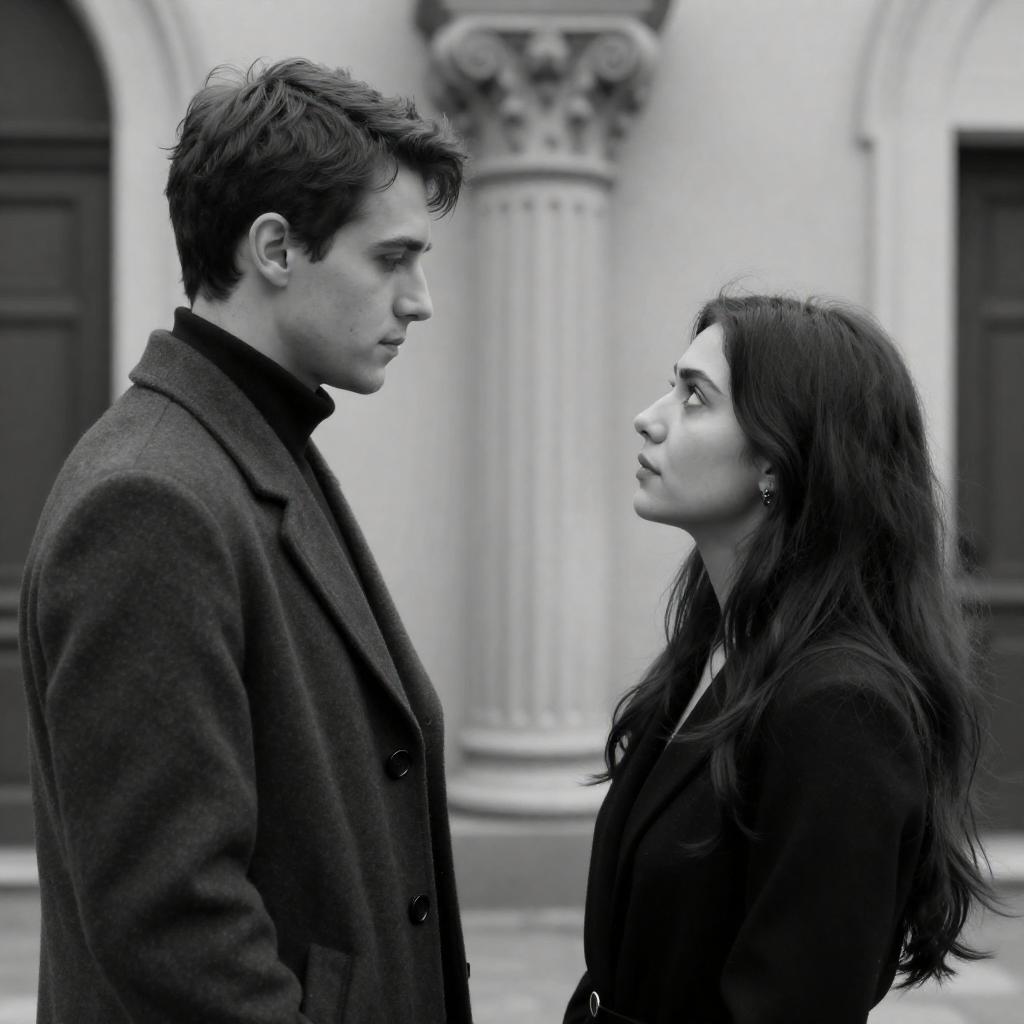 Black-and-white photograph of a man and woman in an ornate room. The woman with curly blonde hair, white blouse, and black skirt leans forward on a table. The man in a grey suit kneels, looking at her with an intense expression. Piano, chair, and decorative wall items in the background.