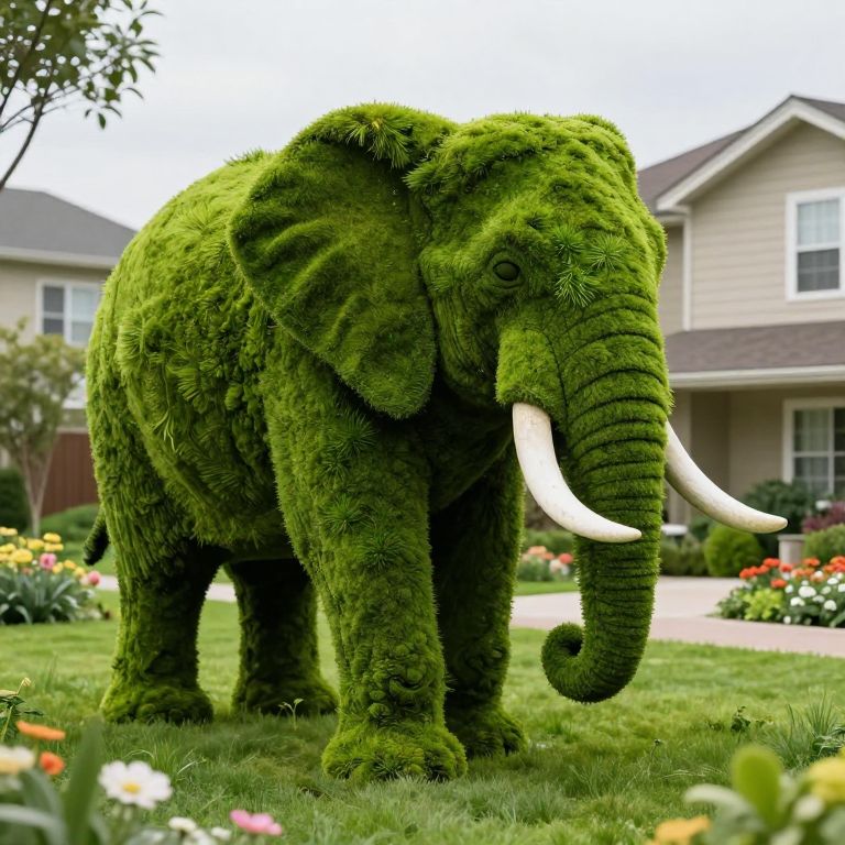 A colossal elephant crafted entirely from lush green moss stands majestically in a suburban garden, its tusks gleaming white against the surreal contrast of manicured lawns and blooming flowers.