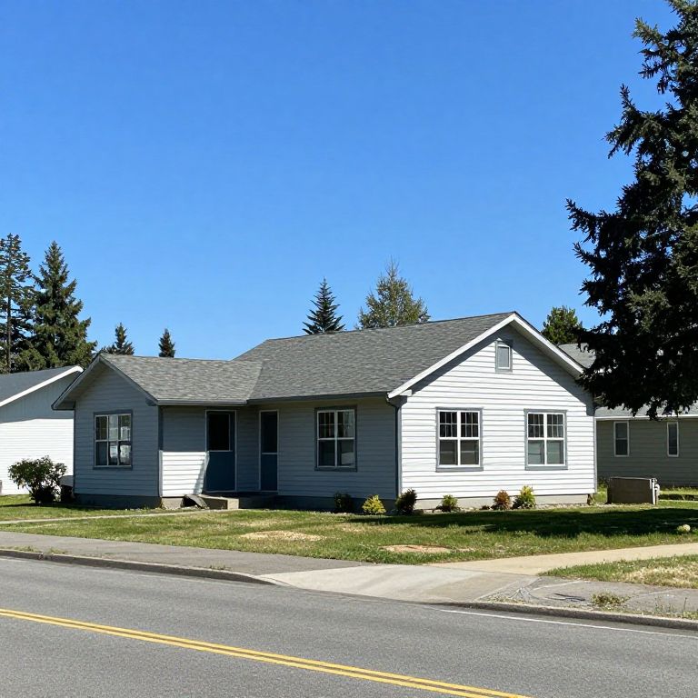 Single-story light gray suburban house with white trim and asphalt shingle roof situated on a corner lot, surrounded by green lawn and trees, under a clear blue sky. Located in a quiet residential neighborhood with a paved road and sidewalk in front.