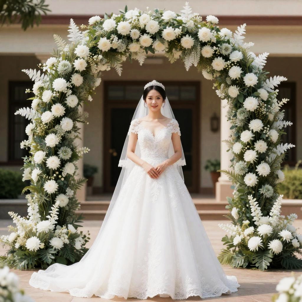 A young woman in a white simple bridal gown with lace detailing and a veil, standing and posing in front of an elaborate floral arch decorated with white flowers and greenery. The setting appears to be an outdoor wedding venue with neutral toned architecture in the background.