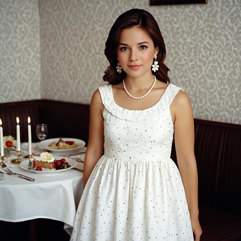 Portrait of a young woman with brown hair and brown eyes wearing a white sleeveless dress adorned with subtle multicolor spots. She accessorizes with a pearl necklace and white floral earrings. The background shows a table set for a birthday lunch with lit candles, a slice of cake, and plated dishes in a softly lit dining area.