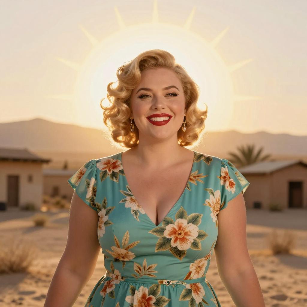 Digital artwork of a curvy blonde woman with vintage curls, red lipstick, and a teal floral dress, smiling confidently. She's centered, with a glowing, circular sunburst behind her. The background shows a desert-like landscape with mountains and old buildings, slightly blurred. The camera angle is eye-level, and the lighting is warm, highlighting her features. The depth of field keeps the woman in sharp focus while the background is softly blurred.