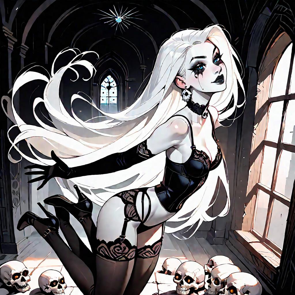 Score_9, score_8_up, score_7_up, score_6_up, score_5_up, score_4_up, cartoon, (disney:1.2), high contrast, source_cartoon, dim lighting, realistic, 1girl, full body, white skin, painted skin, dark background, abandoned church, reinforced concrete, indoors, glowing screens, neon lights, (lingerie:1.2), bra, thong, corset, long stockings, long gloves, white neck, choker, arched back, half-closed eyes, above ground, floating, floating hair, hair spread out, spread arms, legs together, earrings, jewelry, breasts, multicolored hair, very long hair, white hair, skull, black sclera, high heels, facepaint, black lips, runny makeup