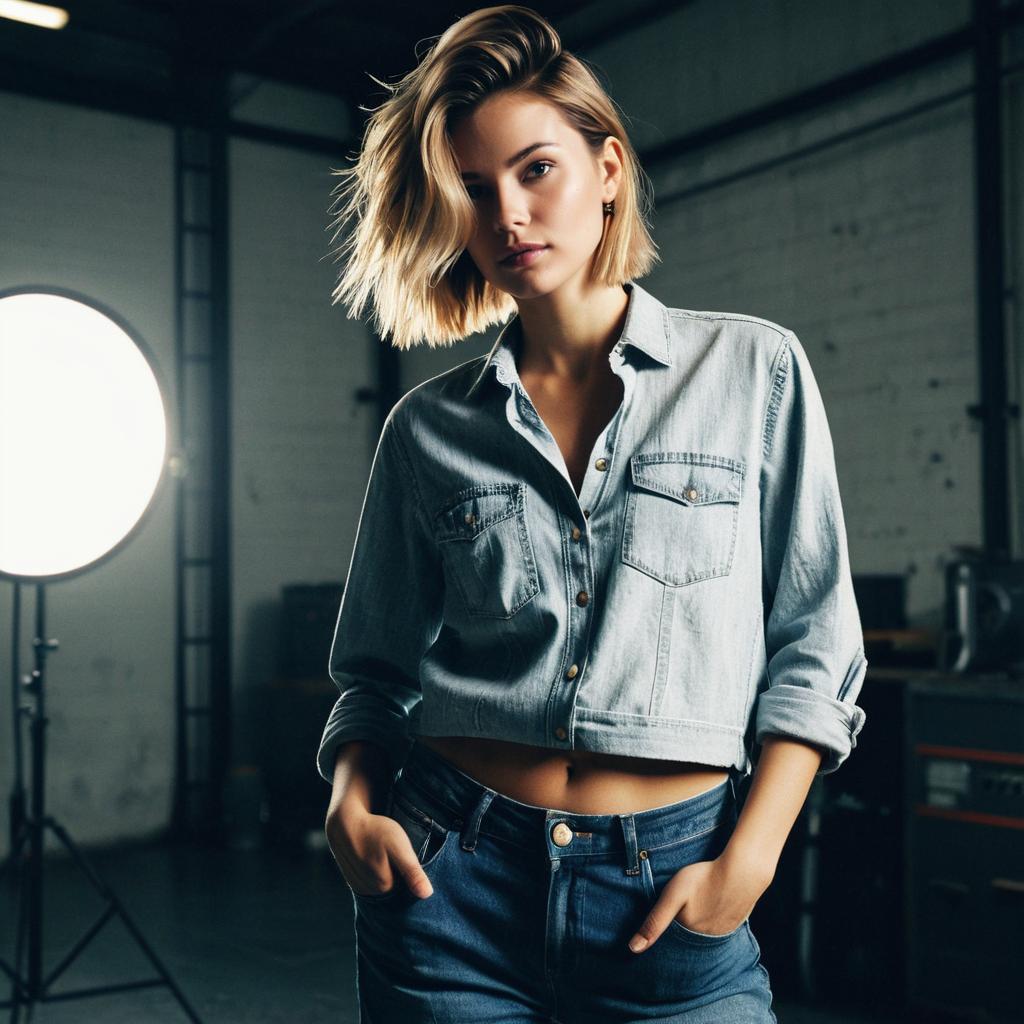 Textured Crop hairstyle on woman, wearing leather jacket and skinny jeans, in neon-lit alleyway, captured in fashion editorial style with moody colored spotlights.