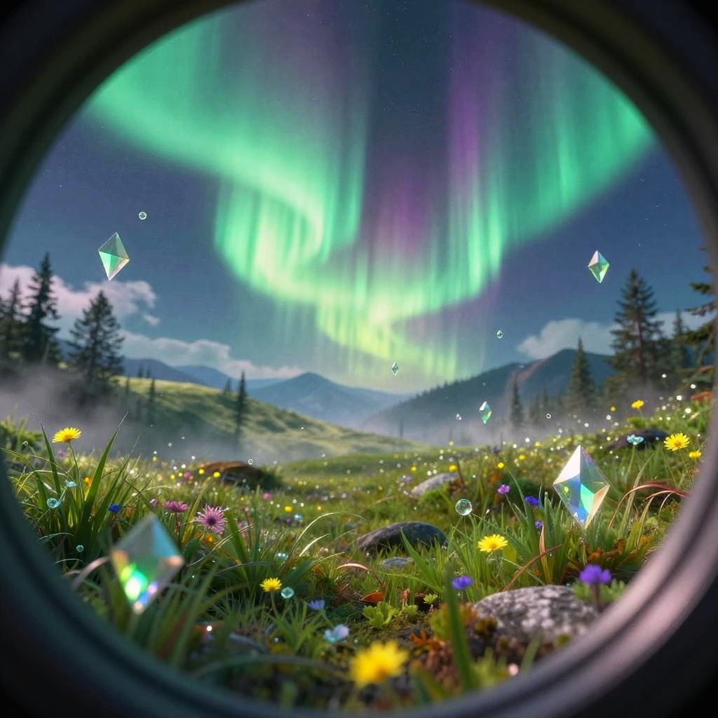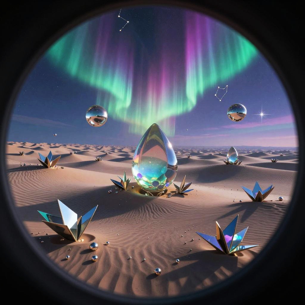Prismatic Micro-Desert with Aurora and Reflective Orbs