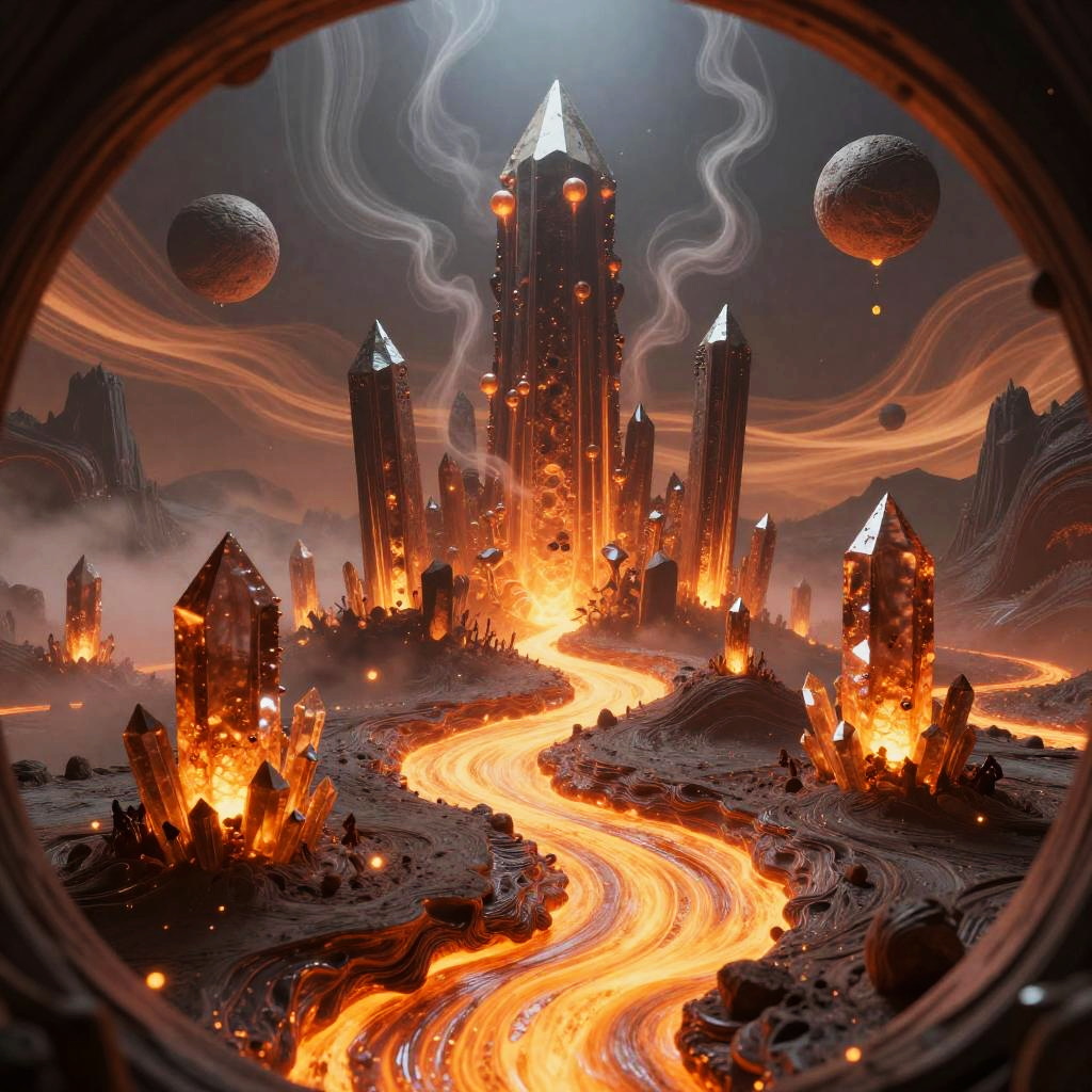 Shamanism Prismatic micro-desert of glass dunes on a drifting seed-island of beautiful unique abstract nature, endless view of glowing nature, levitating mercury droplets and liquid mirrors, orbiting miniature moons, ribbons of prismatic aurora and vapor, floating origami-like leaves, scattered metallic bead constellations, vibrant, ambient, layers of background scene, beautiful render, complex render, highly detailed render, unreal engine, cinematic lighting, smooth render, octane render, photorealistic, bold clear colours, camera angle looking through a lens, detailed complex background layers, background layers make you look through the image, 8k, 3d, abstract.