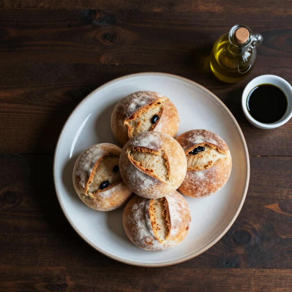 Top-down photo of a hand-thrown ceramic plate with artisanal bread rolls, olive oil, and balsamic vinegar, on dark wood, moody premium lighting, professional food photography, empty space for text in the corner