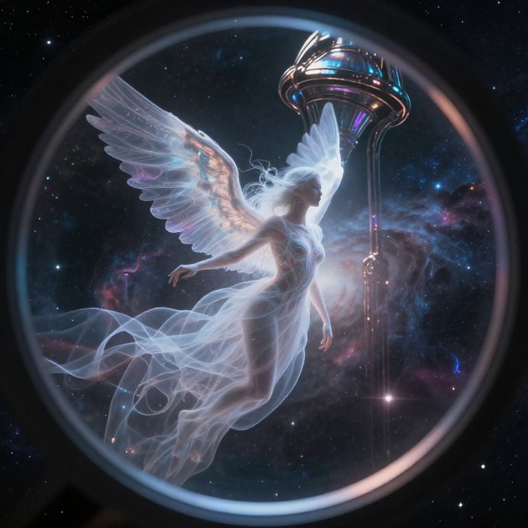 Digital art of a glowing, ethereal angel with translucent wings, neon blue and pink accents, floating against a swirling galaxy background.