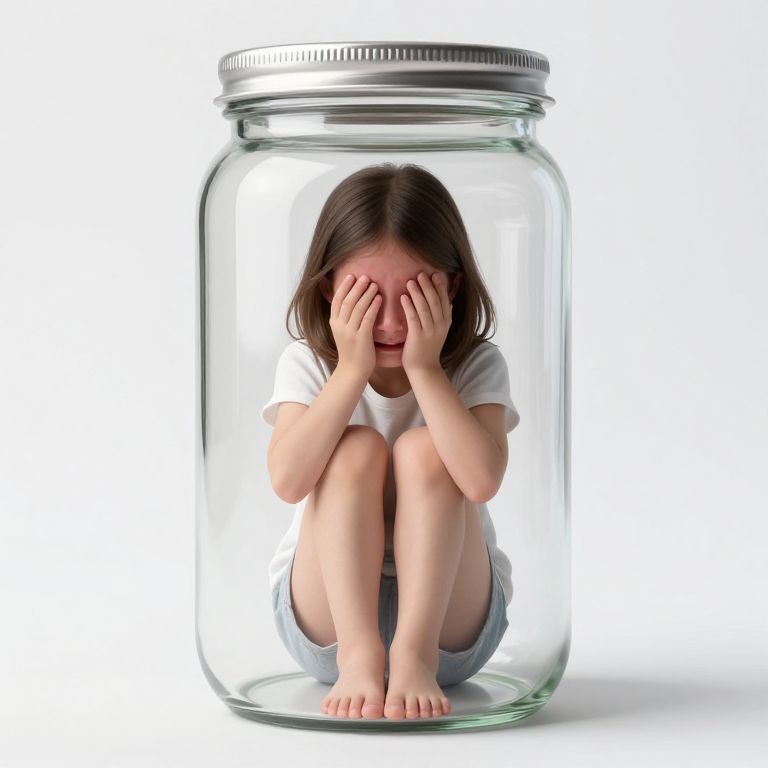 Photograph of a crying, brown-haired child with white shirt and gray shorts, hands covering face, sitting inside a clear glass jar.