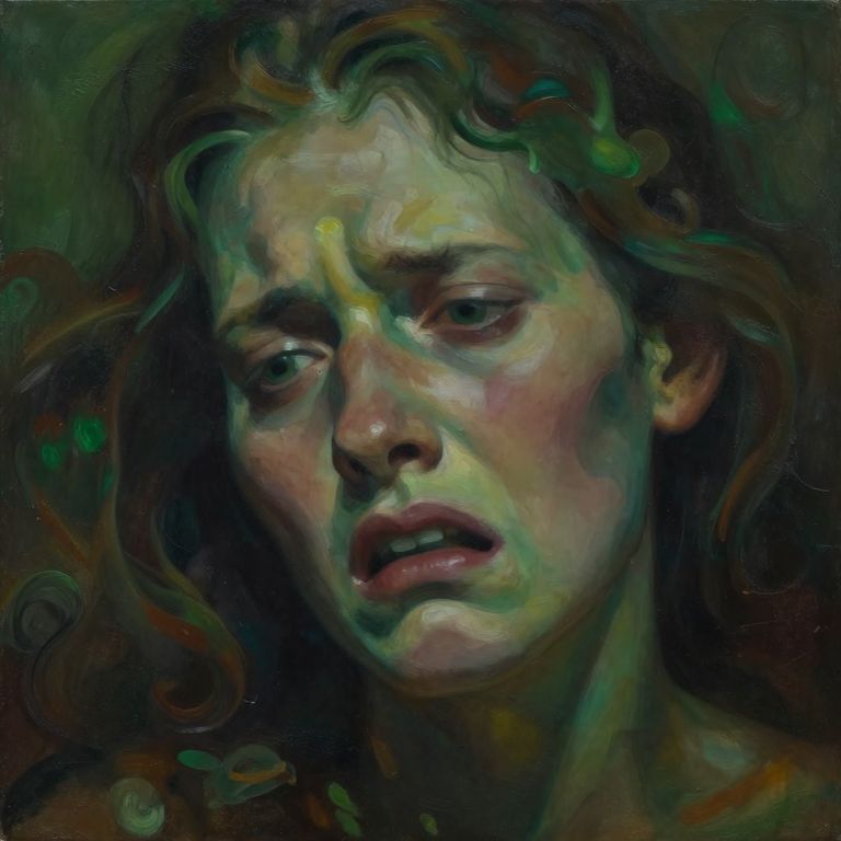 Disgust portrayed in a surreal style, a face twisted with aversion amid swirling, dark green and brown hues, organic textures blending into the background, conveying deep emotional repulsion, soft eerie lighting, expressionist artwork.