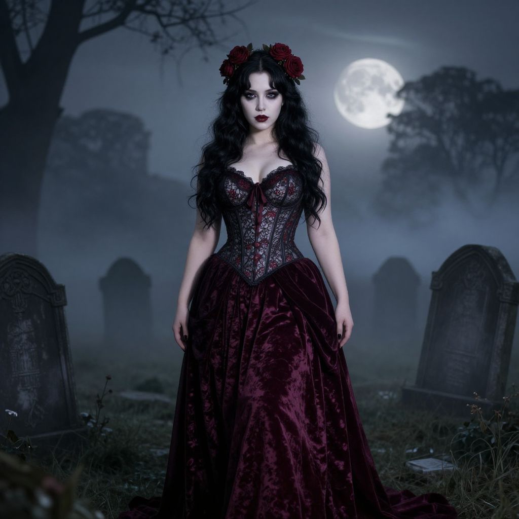 BBW gothic woman standing in a misty ancient graveyard at dusk, wearing a lace corset and flowing velvet skirt, dark makeup with roses entwined in her black hair, eerie full moon casting shadows in the background, mystical and enchanting atmosphere.