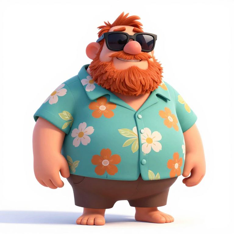Blot a full body cartoon of a fat dad, smiling, hawaiian shirt, ginger beard, very skinny legs, wearing dark sunglasses in the style of pixar on a white backgound,