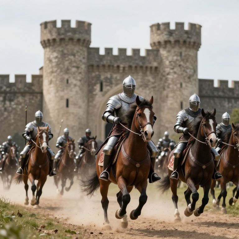 Medieval knights on horseback charging towards a castle, with one knight leading the charge.