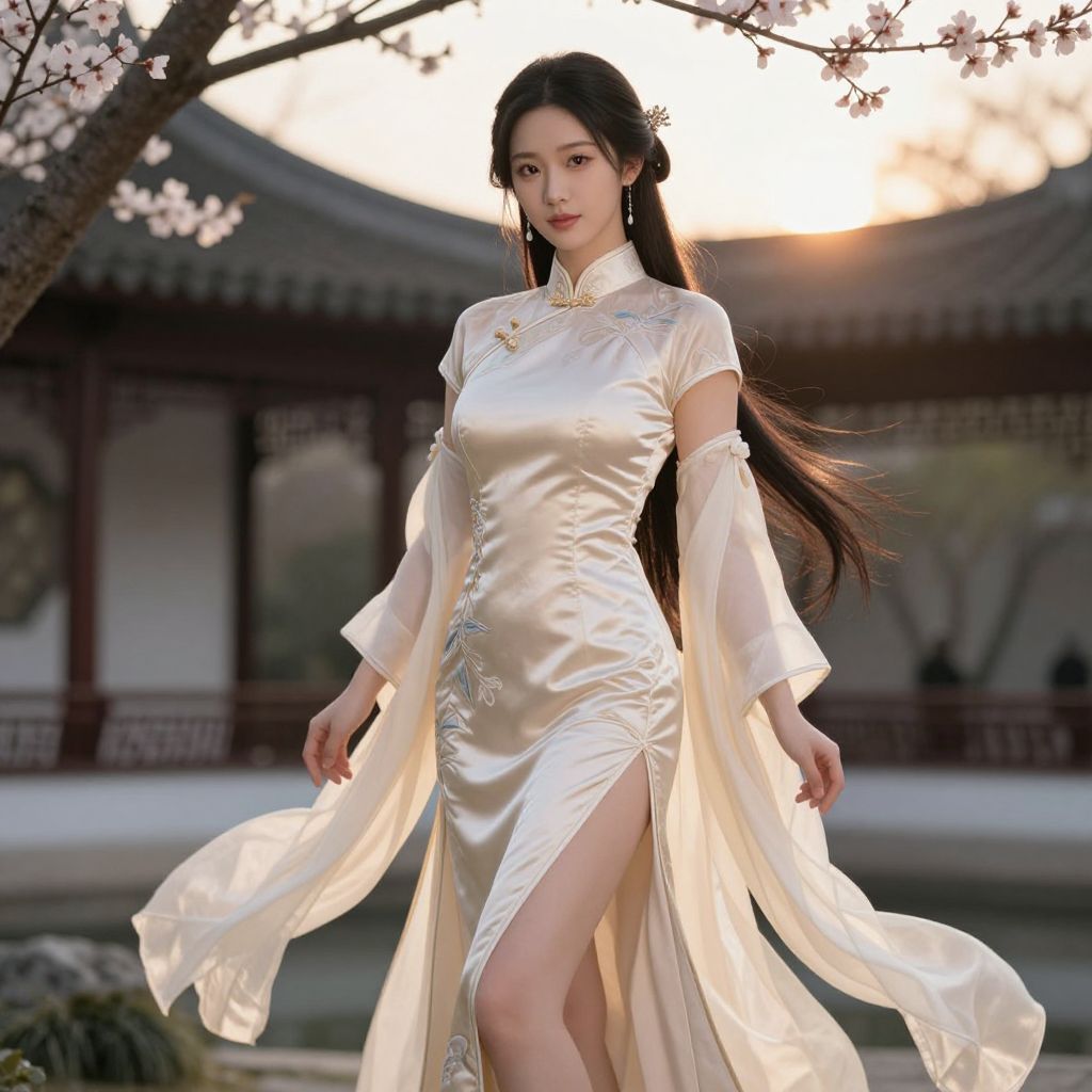 Photograph of an East Asian woman with long, dark hair, wearing a white silk cheongsam with gold embroidery and detached white sleeves. The dress has a high slit on the left side, revealing her leg. She stands in front of a traditional Chinese building with a curved roof and cherry blossoms in the background, illuminated by a setting sun. Her expression is calm, and her posture is confident. The lighting casts a warm, golden glow, enhancing the texture of the silk fabric.