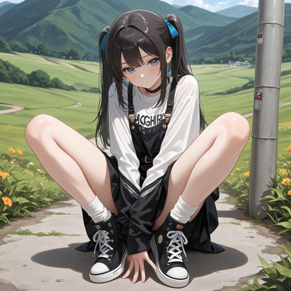 A digitally illustrated Korean girl sitting on a concrete path surrounded by green hills and yellow flowers. She has long dark hair styled in ponytails with blue ribbons, wearing a white long-sleeve shirt under black overalls, paired with white socks and black sneakers. The background features lush green hills and a metal pole to the side, emphasizing a peaceful rural outdoor setting.