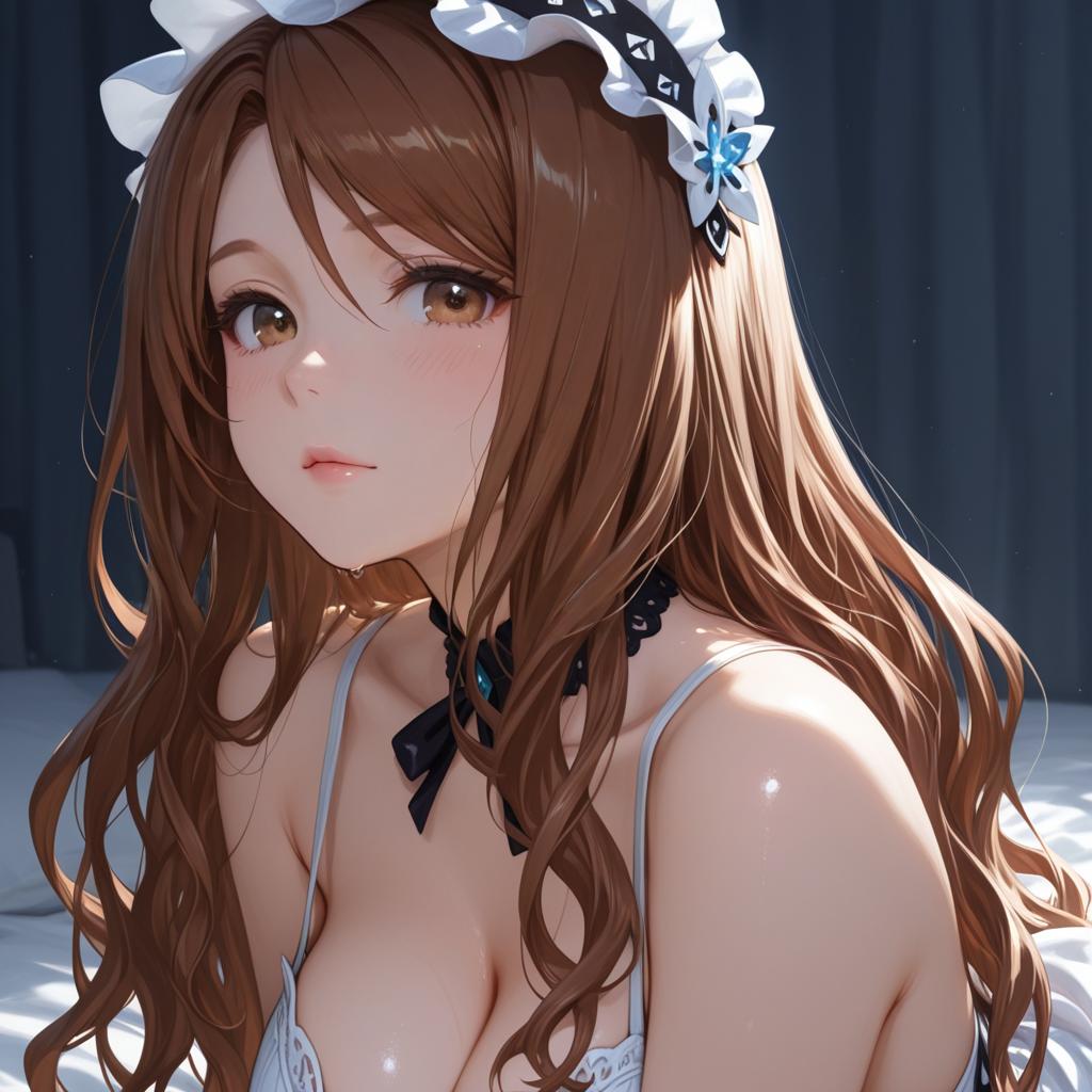 Digital illustration of an anime-style young woman with long brown hair and large brown eyes, wearing a dark blue top with floral lace details and a small green pendant necklace. The character has a serious expression and soft blush on her cheeks, depicted in a highly detailed, polished anime art style.