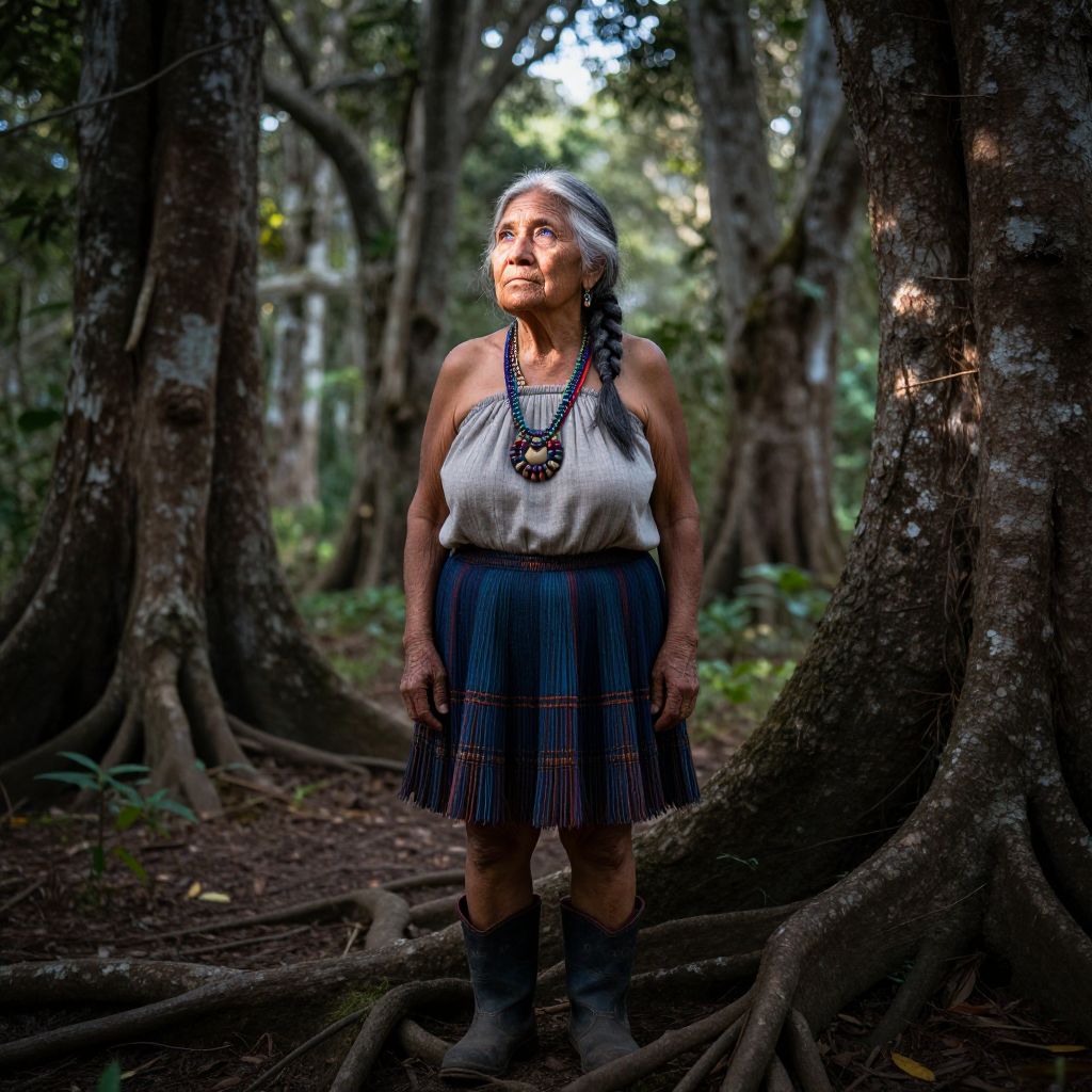 Photograph of an elderly Indigenous woman standing in a dense forest. She has a medium build, medium brown skin, and long gray hair tied back. She wears a white sleeveless blouse, a blue plaid skirt, black boots, and a beaded necklace. Her arms are adorned with traditional tattoos. The forest background is filled with large, thick-trunked trees and dense foliage, with sunlight filtering through the leaves. The image has a natural, earthy color palette with a focus on greens, browns, and blues, and has a slightly dramatic, high-contrast lighting effect.