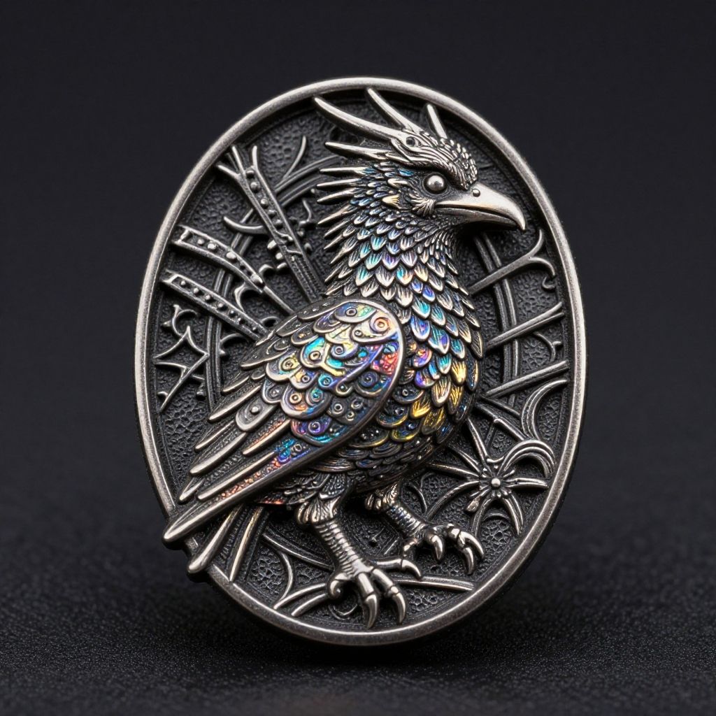 Metal trinket depicting a Steeple Roc Johji Manabe, natural, shimmering, vibrant, gothic, rpg, 1400ad, ultra detailed, detailed, immersive, reminiscent of high fantasy RPG games, HD, masterpiece, best quality, hyper detailed, super realistic, perfect face, perfect hands, award-winning, professional, breathtaking, linquiveradreary Plateaufrosty weatherluxury product style . elegant, sophisticated, high-end, luxurious