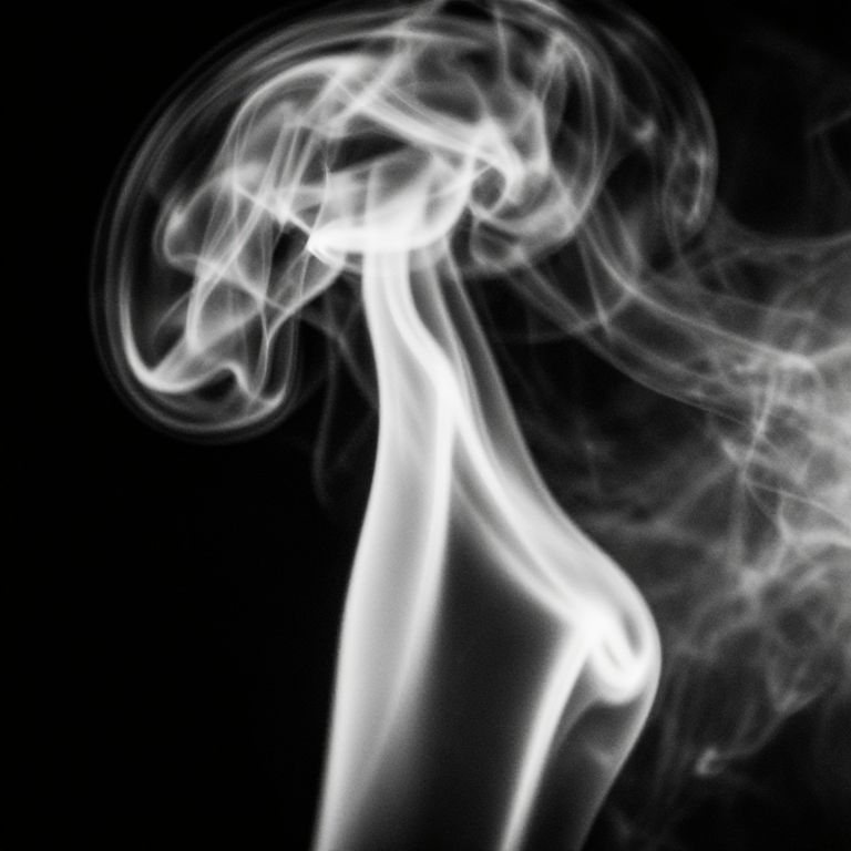 Smoke photo featuring dramatic black and white aesthetics, thick smoke billowing in strong, bold shapes with high contrast highlights and deep shadows, abstract composition emphasizing movement and form, grainy film-like texture adding vintage feel.