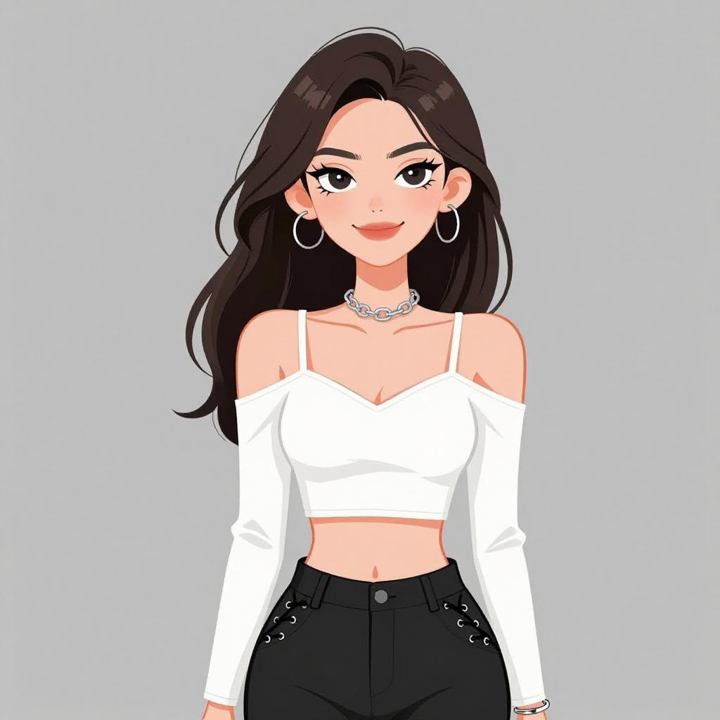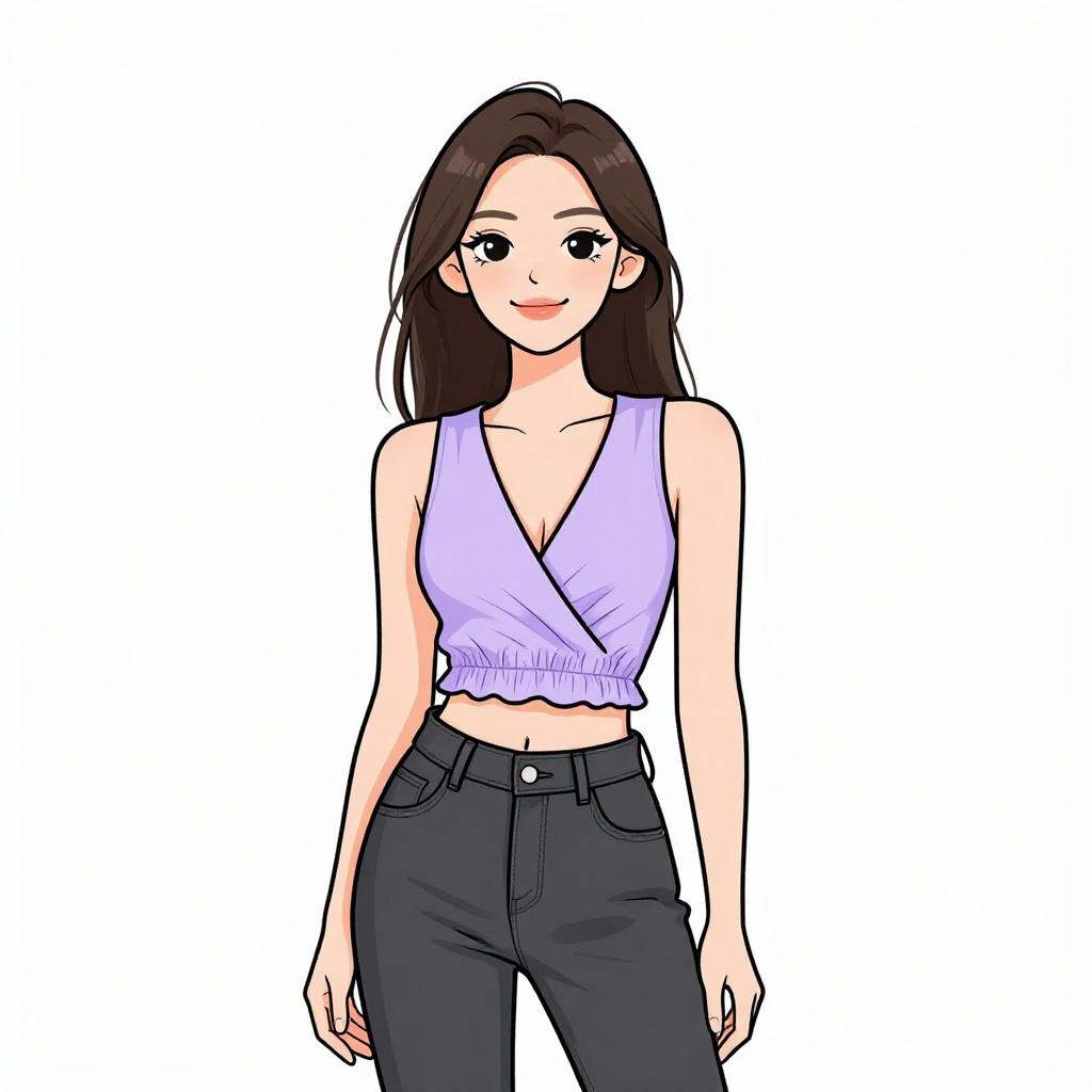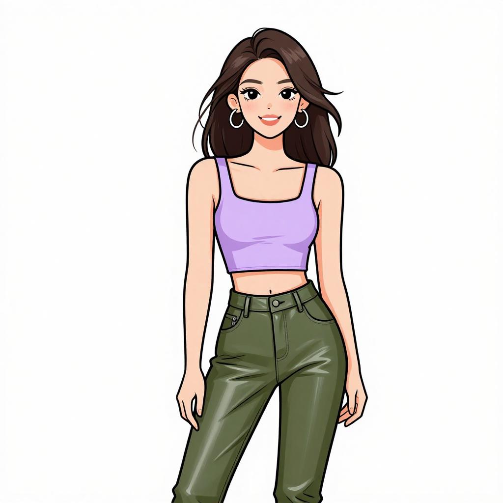 Woman with pretty face and pretty hair. smiling Woman, modern streetwear, cropped tank top in light purple, square neckline, wide shoulder straps, high-waisted faux leather pants in olive green, glossy finish, straight cut, pockets with zipper details, photo studio background with a white seamless backdrop. --sref 1467
