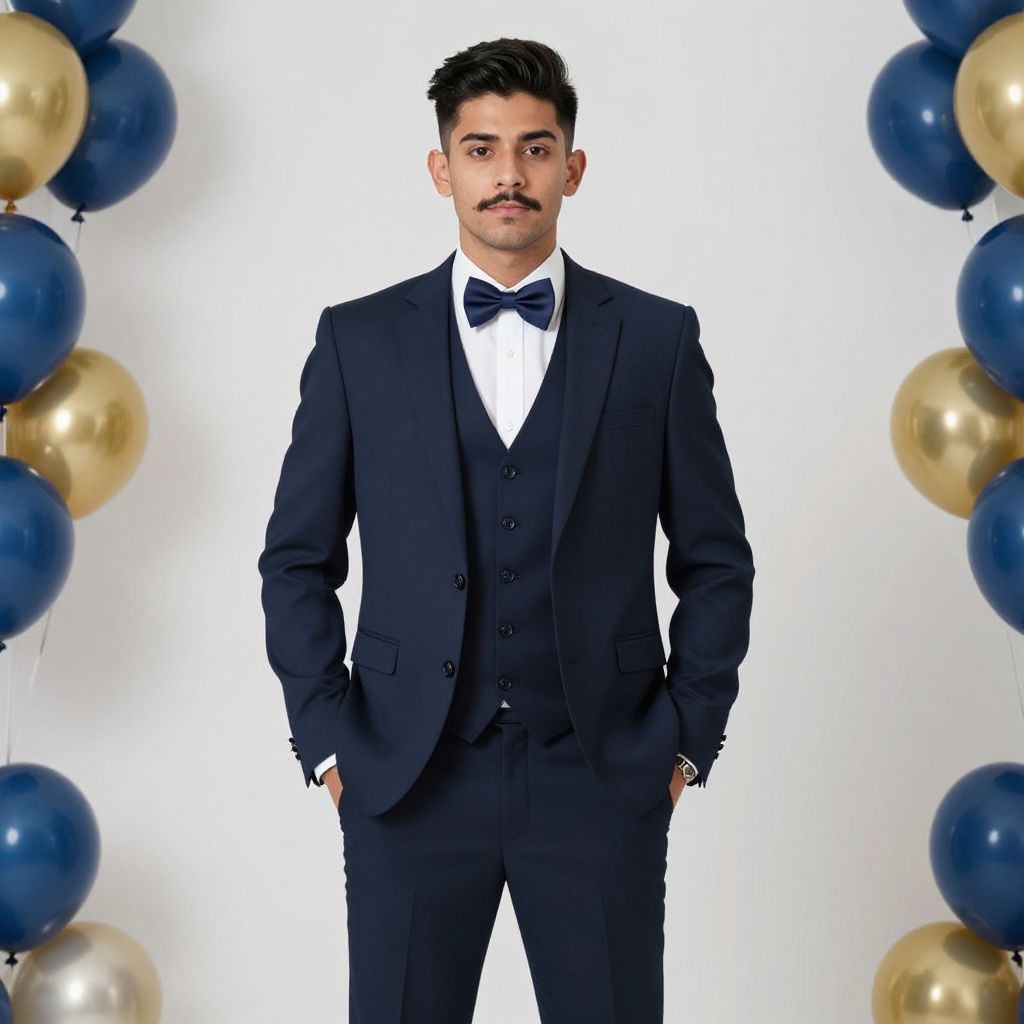 Abc themed party outfit, 1boy, male focus, solo, hands in pockets, bow, bowtie, black hair, formal, vest, pants, looking at viewer, mustache, suit, facial hair, shirt