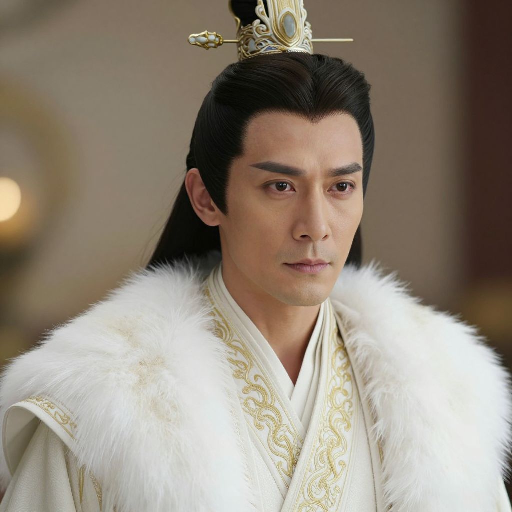 Photograph of a serious East Asian man with long black hair, dressed in an elaborate white traditional robe adorned with gold embroidery and a luxurious white fur trim. He has a fair complexion and is wearing an ornate gold hairpiece with a small bird figure. The background is softly blurred, featuring warm, dim lighting that highlights the subject. His expression is calm and composed, conveying a sense of dignity and authority. The image emphasizes traditional Asian royal or noble attire.