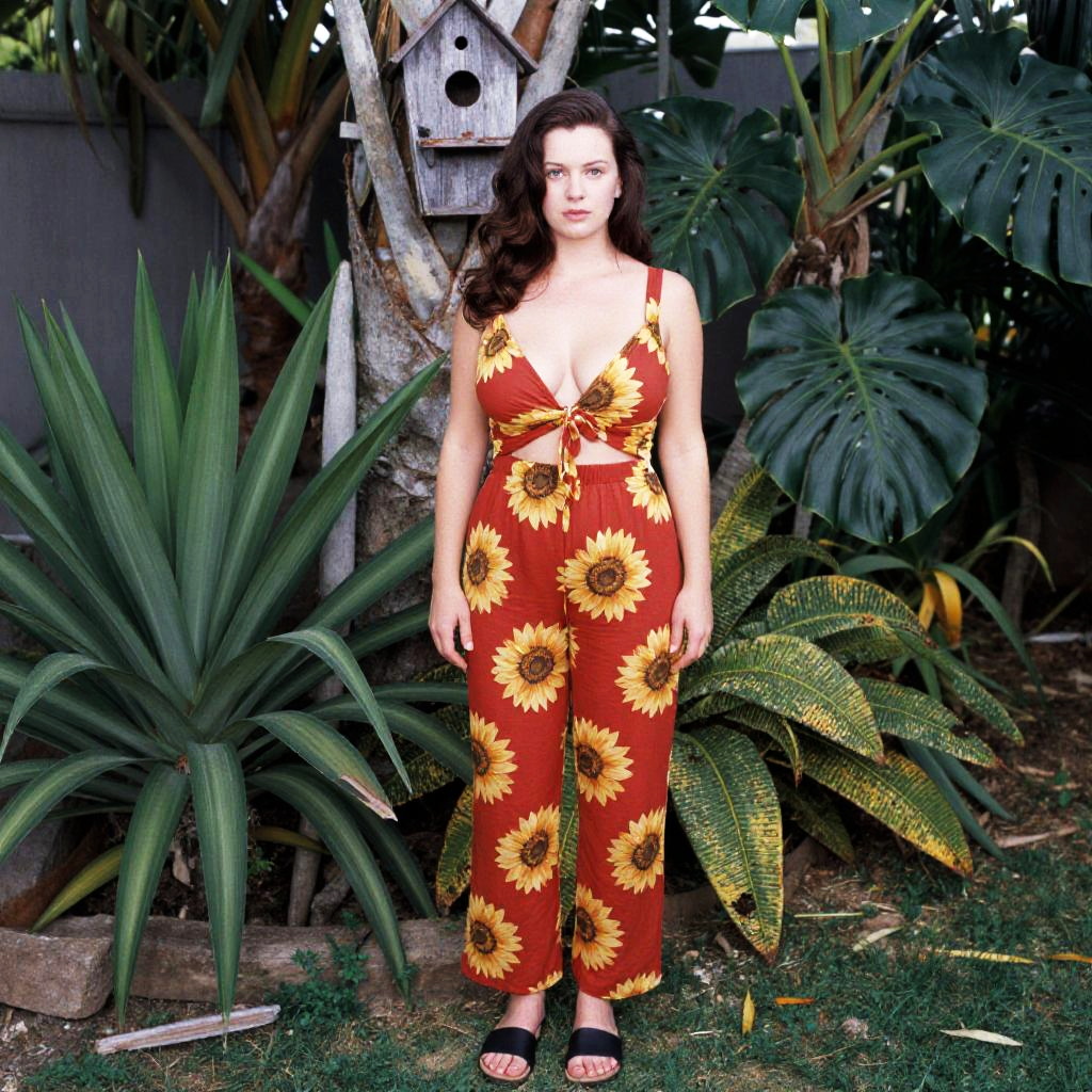 Photograph of a young woman with fair skin and long, wavy brown hair standing in a tropical garden. She wears a vibrant red jumpsuit with large yellow sunflower patterns, featuring a deep V-neckline and a tied waist. Her black sandals contrast with the bright outfit. Behind her, large green tropical leaves, including a prominent birdhouse on a tree trunk, and a dark gray fence are visible. The sunlight illuminates her face and the colorful fabric of her jumpsuit, creating a striking visual against the lush greenery. Her expression is neutral, and she stands with her arms relaxed by her sides.
