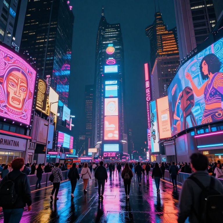 Mythdhr.con futuristic cyberpunk cityscape bustling with neon lights and towering skyscrapers, digital billboards glowing, dense crowds in high-tech attire, rain-slick streets reflecting vibrant colors, a blend of ancient mythology symbols and advanced technology, cinematic lighting
